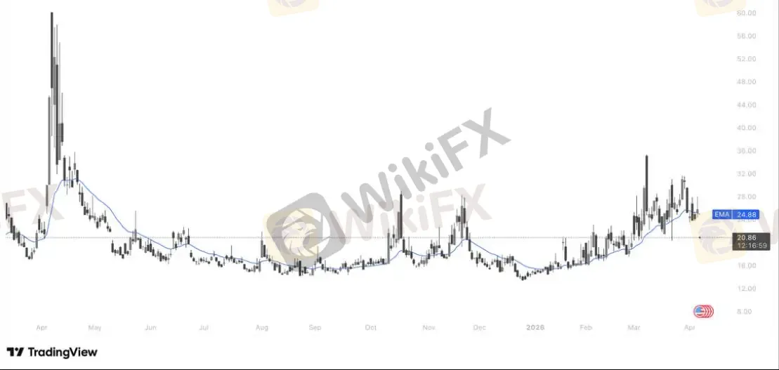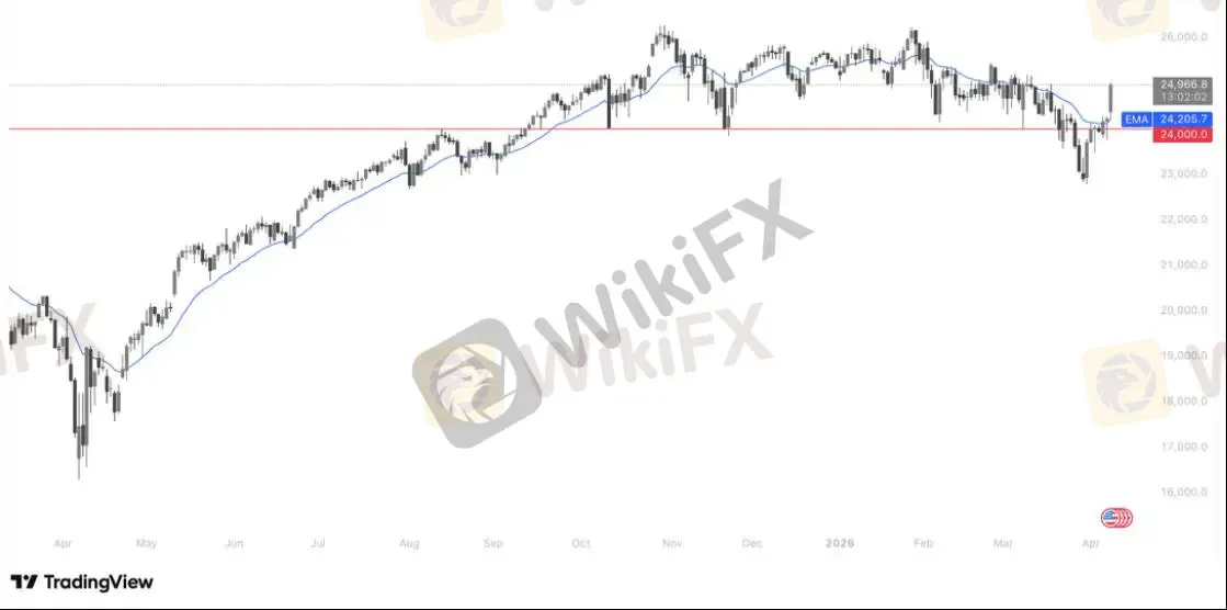 市场此前在 3 月底有效跌破了 24,000 点 的长期红色支撑线,引发了一轮恐慌性抛售,最低触及约 22,800 点。然而,近期价格以强劲的 V 型反转态势重新站回 24,000 点关口上方,特朗普“taco”之后,初步释放了止跌信号。目前价格正紧贴 20 日指数移动平均线 (EMA 20) 运行。该线目前位于 24,206 点附近,是短期多空强弱的分水岭。后市仍维持偏多路径: 若未来几个交易日能放量突破并站稳在 EMA 20 之上,上方目标将指向 25,000 点 附近的密集套牢区。