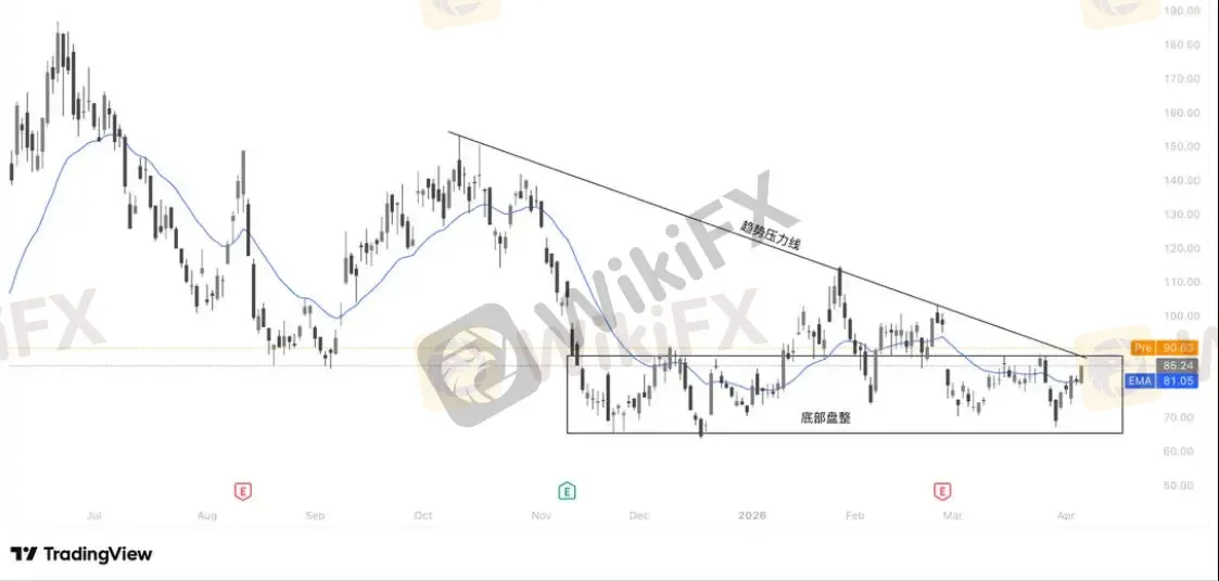 技术面:筑底盘整,静待突破。 股价在经历长期回调后,目前在 70-100 美元的宽幅区间内进行“底部盘整”,近期虽受到上方黑色趋势压力线的压制,但已稳步站上 EMA 20 均线(81.05)。当前股价(盘前约 90.63)正试图挑战压力线束缚,一旦带量突破该斜线,上方空间将被打开,技术形态将从防御转为进攻。