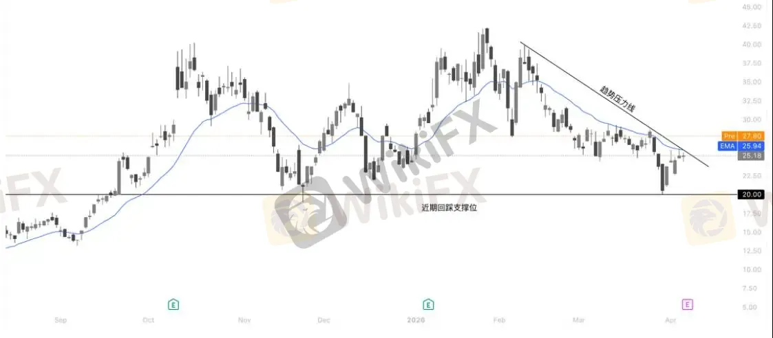 从日线图结合最新行业数据来看,CoreWeave (CRWV) 目前正处于长期下降趋势线与底部横盘区间的交汇点,呈现出极具潜力的“筑底”特征。