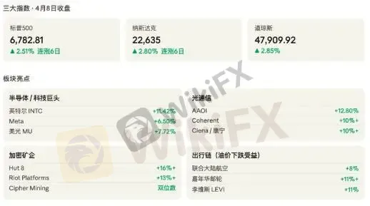 4 月 8 日美股在中东停火预期推动下全线大涨,三大指数均收涨超 2%,纳指与标普 500 斩获六连涨,市场风险偏好显著回暖。板块上 AI 算力产业链全线爆发,半导体、存储、光通信集体走强,英特尔、Meta 等科技龙头领涨,出行板块受油价下跌提振反弹,中概股同步走高。尽管美伊谈判、霍尔木兹海峡局势及美联储政策仍存变数,但短期 AI 产业催化密集,大盘连续上攻后可等待回踩机会,科技主线依旧是市场核心。