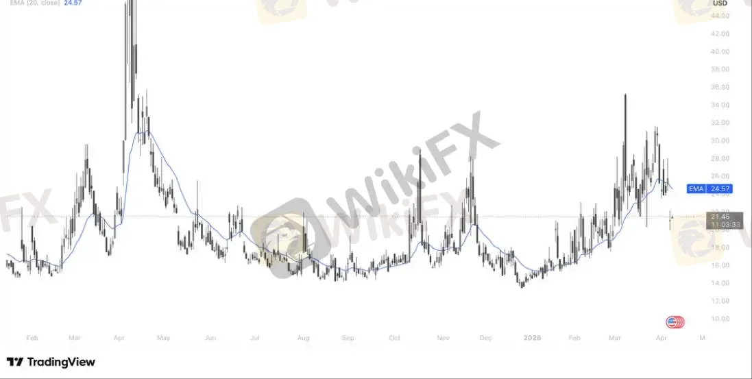 VIX 最新报 21.47,已显著跌破 20 日指数移动平均线(EMA 24.57),短期下行趋势明确。这一走势直观反映出市场恐慌情绪较 3 月的避险高峰大幅降温,美股风险偏好持续修复,波动率从极端恐慌区间回归至 20-25 的中性波动区间。对比 2025 年 4 月的历史极端高点(44 美元上方),本轮冲高幅度相对温和、回落节奏顺畅,反映出当前市场韧性更强,未出现系统性恐慌;后续需重点关注 20 关口的支撑有效性,若守住该位置,波动率有望维持低位震荡,为美股权益资产营造宽松的情绪环境,若指数重新站上 20 日 EMA,则需警惕避险情绪再度升温、市场波动放大的风险。