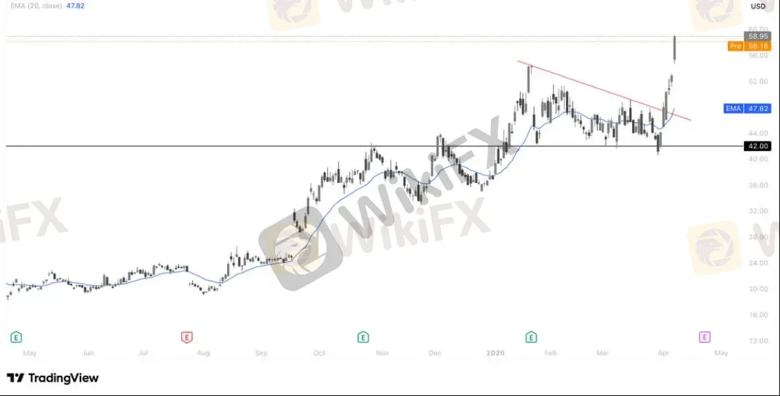 基本面层面,英特尔正式加入马斯克主导的 Terafab 计划,深度绑定 AI 算力基础设施建设,助力马斯克算力帝国版图进一步完善,同时也为自身打开了 AI 芯片、算力服务的长期成长空间,基本面利好成为本轮行情的核心驱动力。不过当前股价短期快速拉升后已进入超买区间,积累了大量获利盘,追高风险显著抬升,不建议投资者盲目追高,重点关注 47-50 美元(20EMA 附近)的回踩支撑窗口,待股价完成充分换手、回踩确认支撑后,再把握低吸布局机会,同时需警惕 AI 算力板块情绪退潮带来的阶段性回调风险。