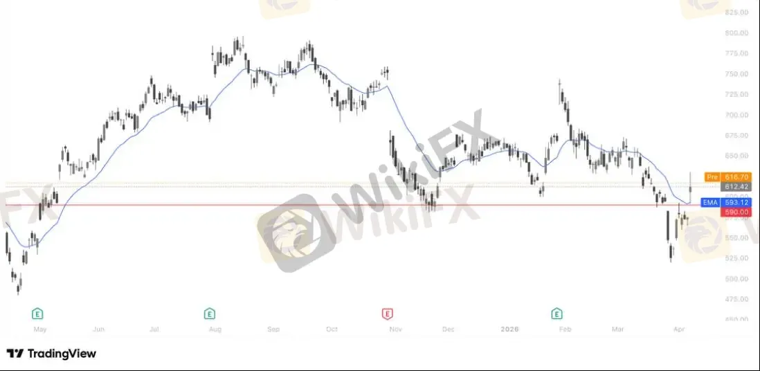 技术面与策略面来看,股价目前站稳短期均线之上,多头力量充沛。不过短期快速拉升后需留意 620-630 区间的潜在压力,若能配合宏观面利好持续发酵,市场风险偏好进一步提升,Meta 股价有望延续升势,向更高区间试探;操作上,建议暂不盲目追高,重点关注590 美元及 EMA 均线附近的回踩支撑位,待确认支撑有效后再布局。
